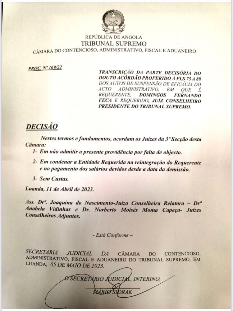 A câmara do tribunal decidiu também “em condenar a entidade requerida (Tribunal Supremo) na reintegração do requerente (Domingos Feca) e no pagamento dos salários devidos desde a data da demissão”.